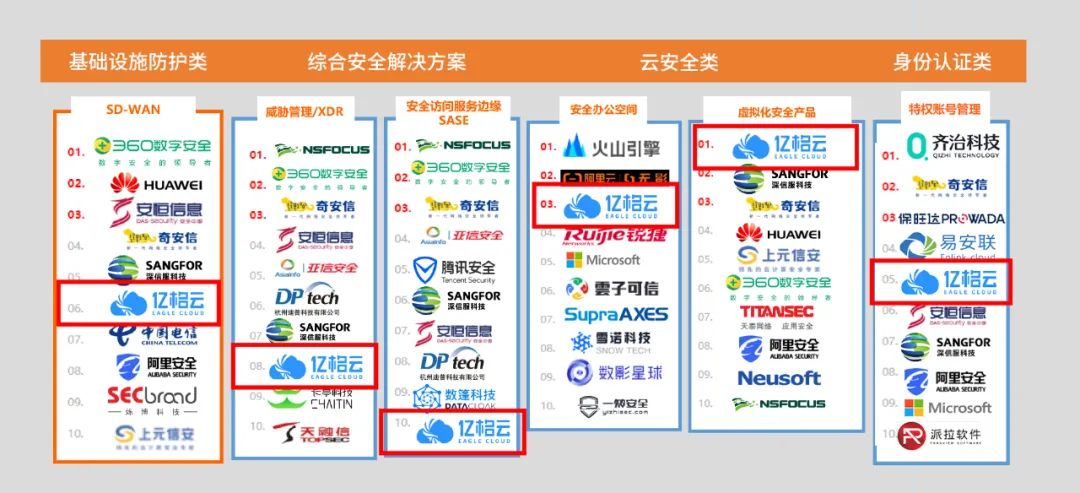 除以上全景图领域入选Top10外,亿格云还入选了数据防泄漏DLP、零信任综合解决方案、VPN/加密机、网络准入与控制、安全审计、APT防护、恶意软件防护、勒索病毒防范、终端检测与响应、终端安全管理、API安全等10余个细分领域。