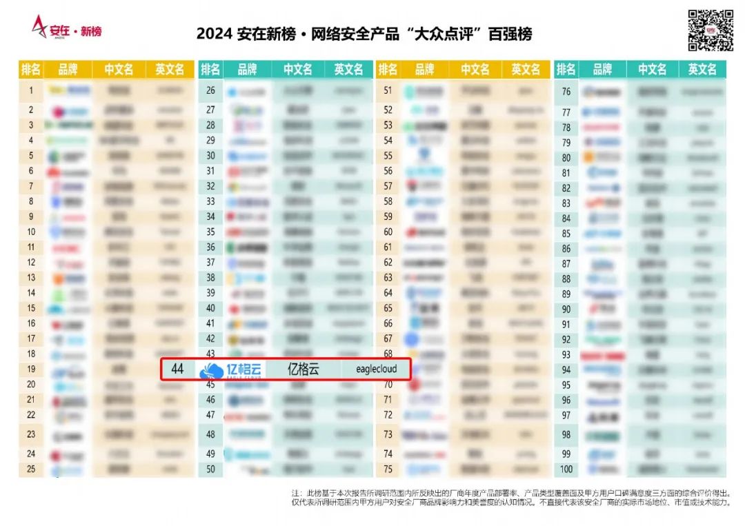 成立仅2年多,亿格云凭借丰富的落地经验和前沿的创新产品,连续2年入选《2024安在新榜网络安全产品“大众点评”百强榜》,今年荣获第44名,还入选“全景图”数据安全、通用网络安全、云安全类、安全服务四项主干领域及其下32个子类领域。