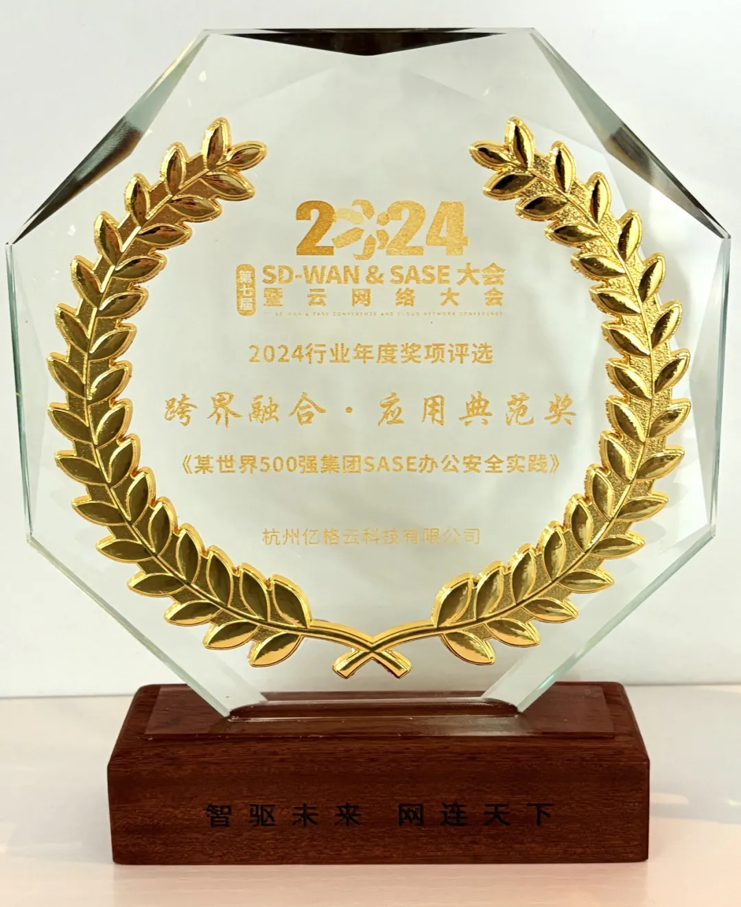 亿格云荣幸受邀参加此次盛会,并以《某世界500强集团SASE办公安全实践》案例,荣获2024年度“跨界融合·应用典范奖”,这一荣誉充分肯定了亿格云SASE一体化办公安全方案的落地应用成果,也是亿格云在SASE领域创新的一大进步。