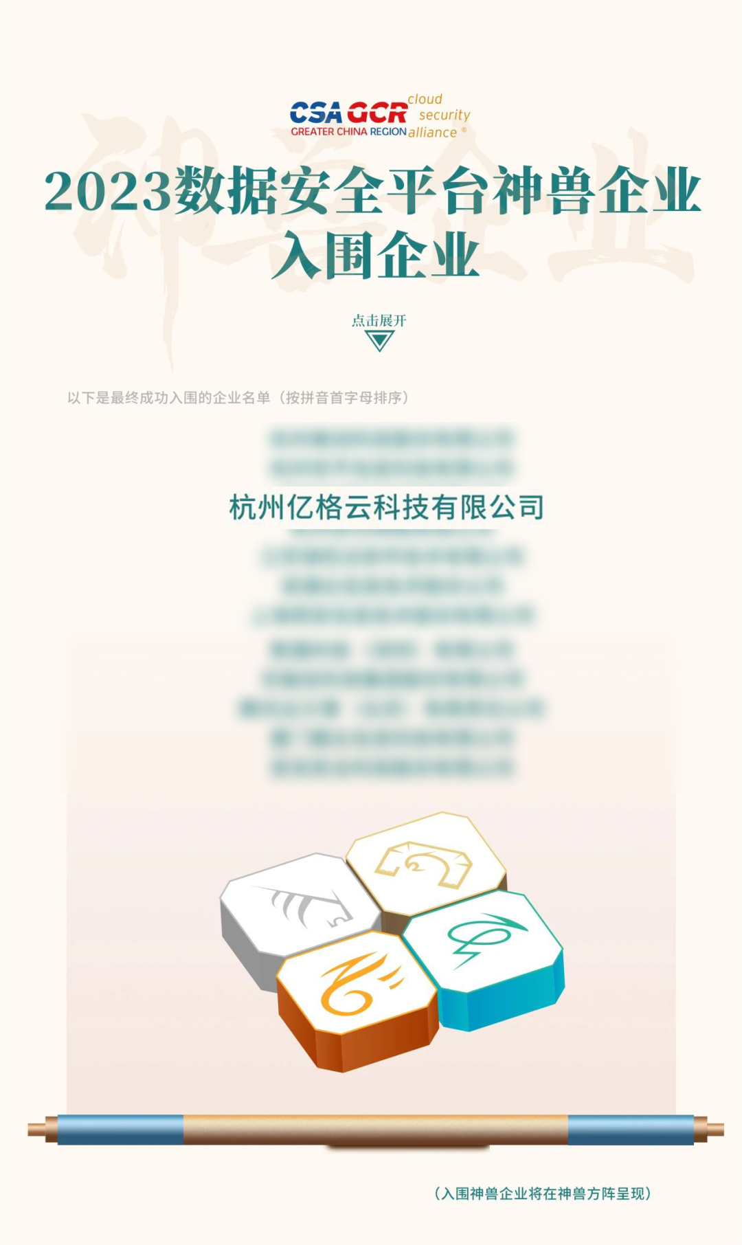 《数据安全平台神兽企业报告(2023版)》针对数据安全平台相关厂商产品发展情况进行专业分析,并就相应数字技术的国内外技术发展趋势、市场容量与前景、国外企业发展情况等方面的分析与总结,为市场发展提供参考。作为数据安全领域新兴探索的佼佼者,亿格云凭借卓越的技术实力、创新的产品理念以及优秀的实践案例,荣获了“CSA 2023 安全创新奖”和“2023 数据安全平台神兽企业—玄武”两项大奖。
