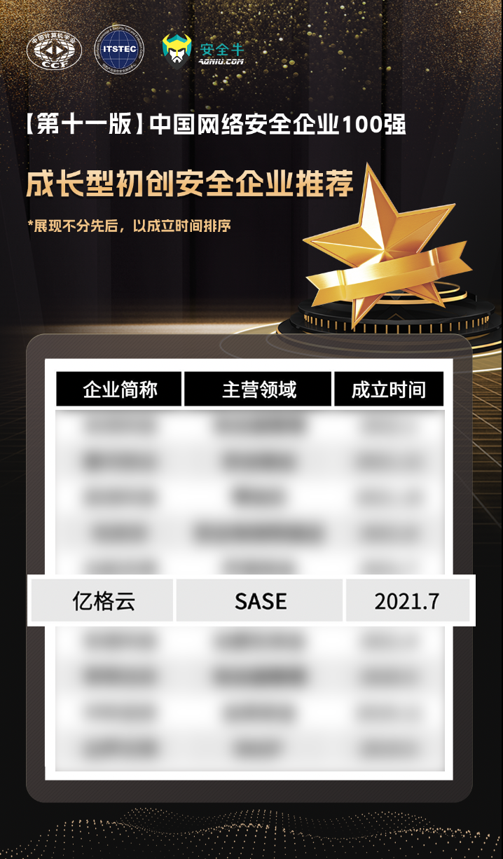 在中国网络安全企业百强评选中,亿格云荣登“成长型初创安全企业”推荐榜单。在全球数字化转型的席卷下,亿格云以安全技术创新顺应着网络安全领域的发展,凭借丰富经验和技术积累,零信任SASE办公安全一体化解决方案已广泛应用于各行各业,为推动网络安全领域注入了崭新的活力。