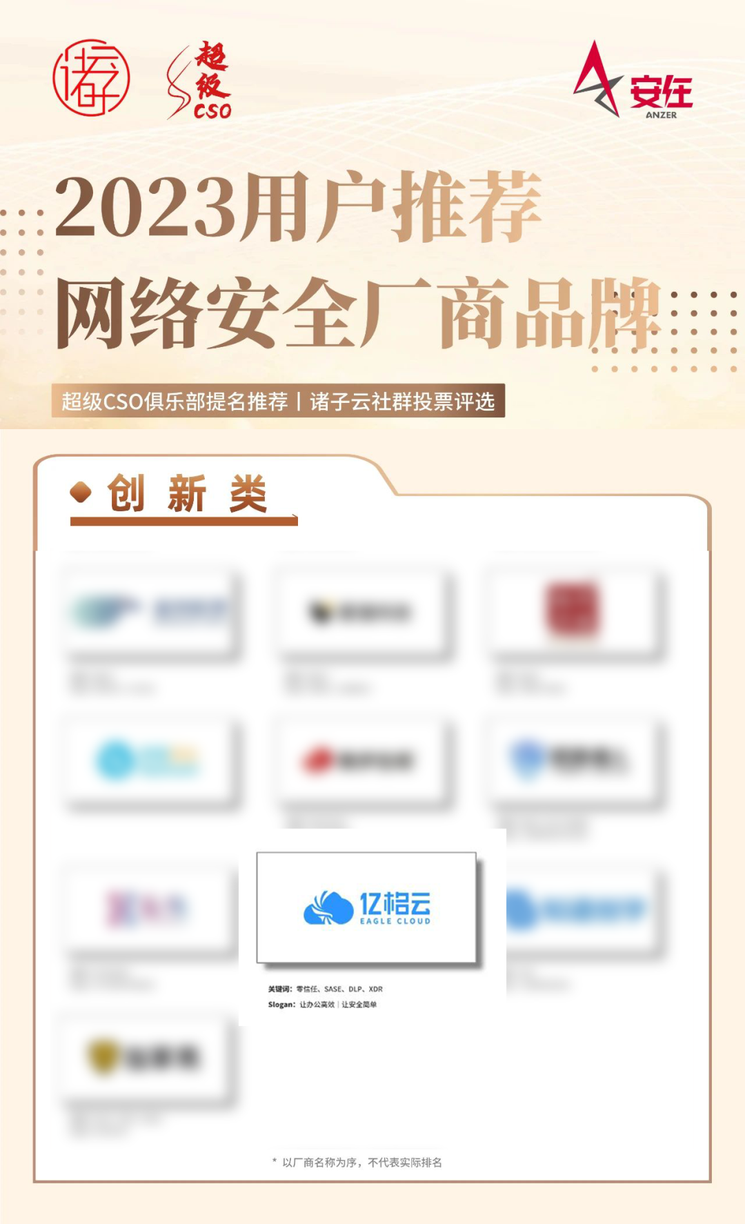 近日,安在新媒体公布了“诸子云 | 2023用户推荐网络安全厂商品牌”年度评选结果,亿格云凭借广受用户认可的自研技术、创新产品与优质服务,上榜创新类用户推荐网络安全厂商品牌。
