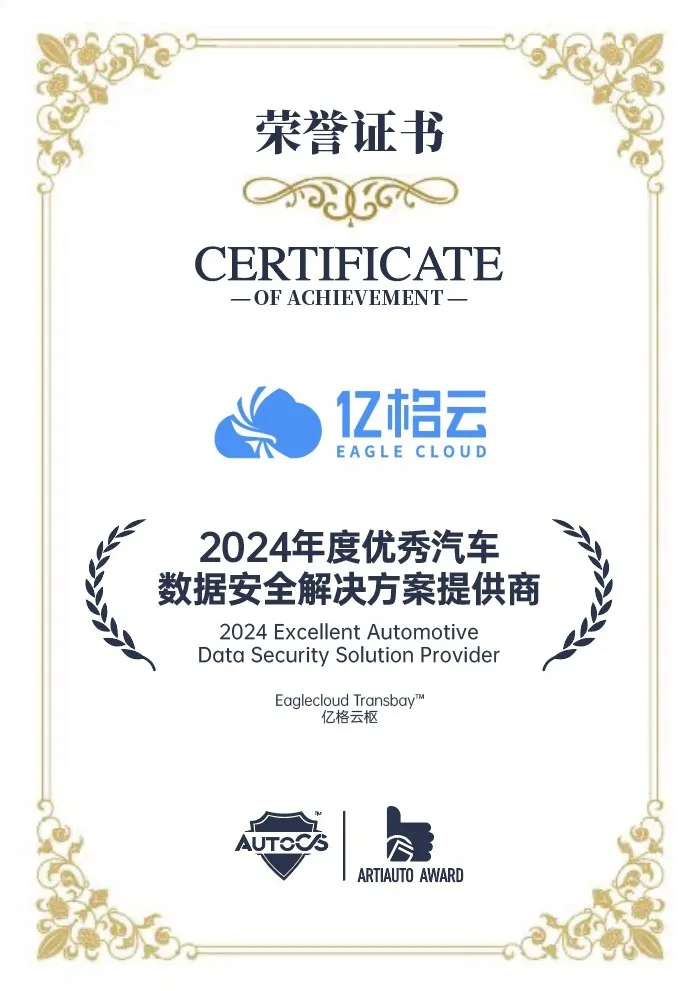亿格云以领先的数据防护能力与卓越的客户服务,成功获得“2024年度优秀汽车数据安全解决方案提供商”荣誉称号。