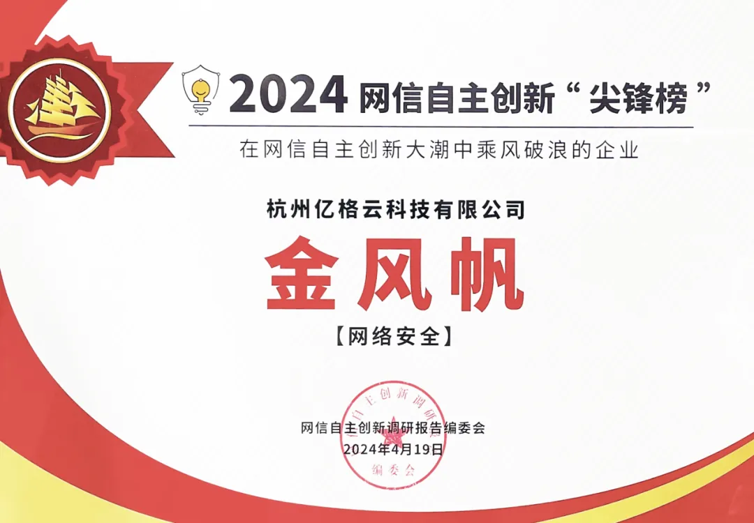 亿格云深度度参编《报告》的数据安全章节,并在现场被授予“2024网信自主创新尖锋榜——金风帆奖”的荣誉奖项。