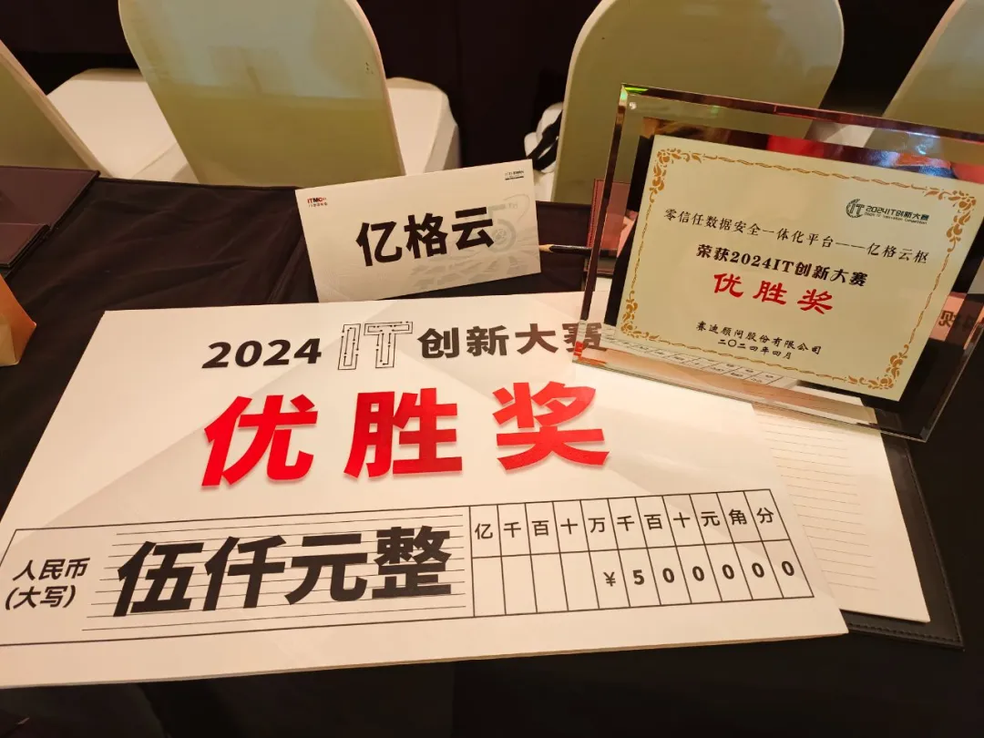 经过激烈角逐,在方案讲解、成果展示、评审答疑等赛程后,亿格云凭借自主研发的零信任数据安全一体化平台——亿格云枢在数据安全领域脱颖而出,斩获“2024IT创新大赛优胜奖”的好成绩。