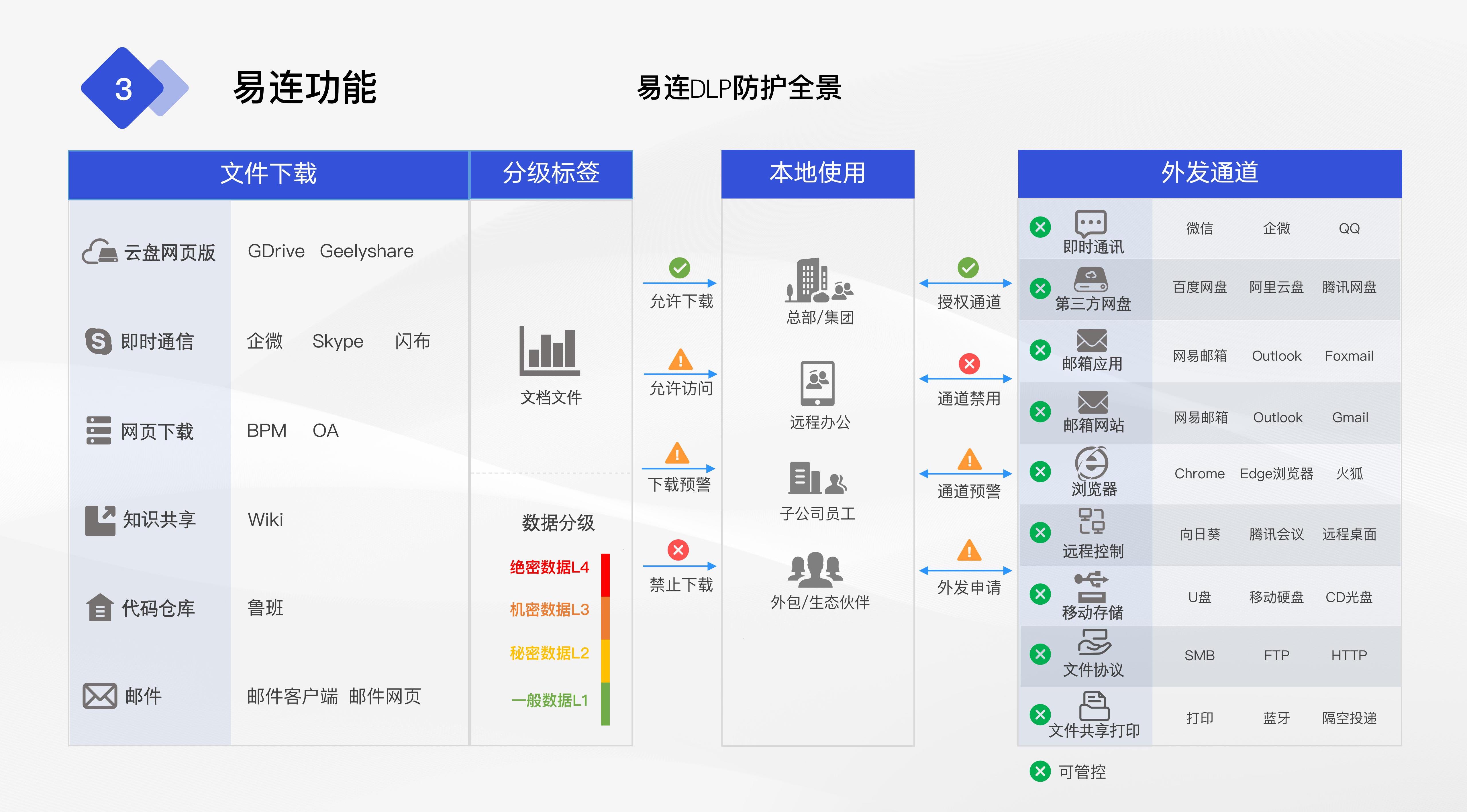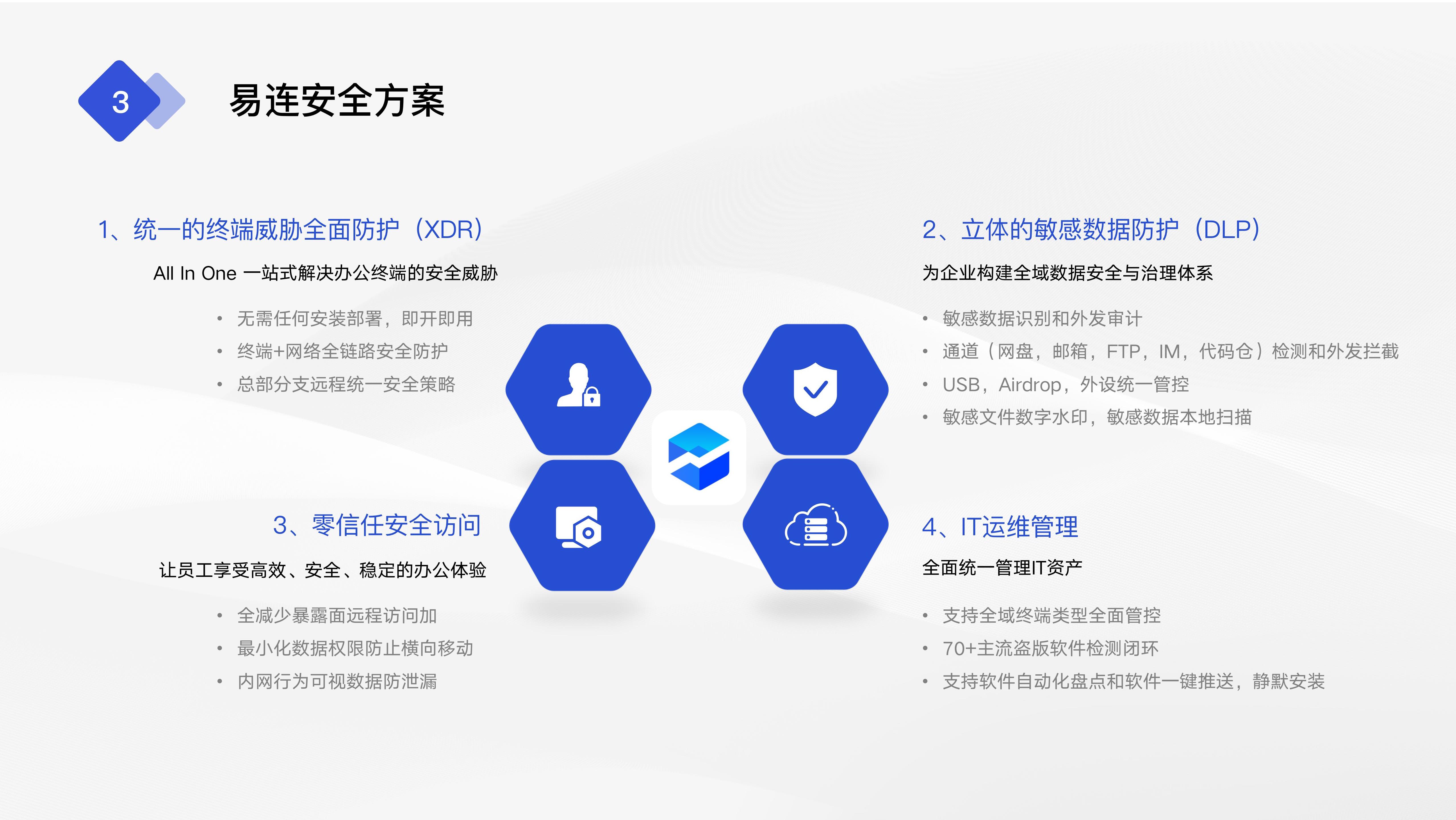 于是,吉利控股在接入亿格云的产品后,借助SDK集成打造了内部的办公安全平台——易连,无任何硬件部署的情况下,只用1个终端Agent,覆盖零信任网络访问终端统一管理,防病毒和终端DLP,并牵引流量到云上DMZ,进行安全防护,保障总部、大型基地、小型分支安全基线一致,方便各分支机构的日常运维,更将安全能力”隐藏“,不打扰用户也不影响体验。