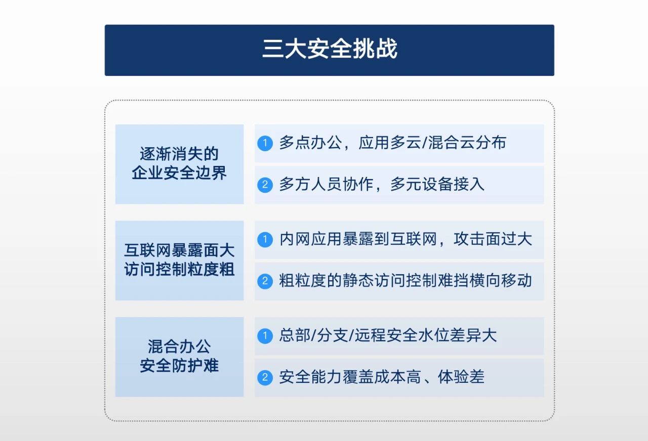 今天,无论是社会还是企业都在进行数字化转型。基础设施云化、办公状态移动化、业务发展互联网化等等加速了企业数字化的步伐。而企业面临这些变化时也带来了诸多安全挑战: