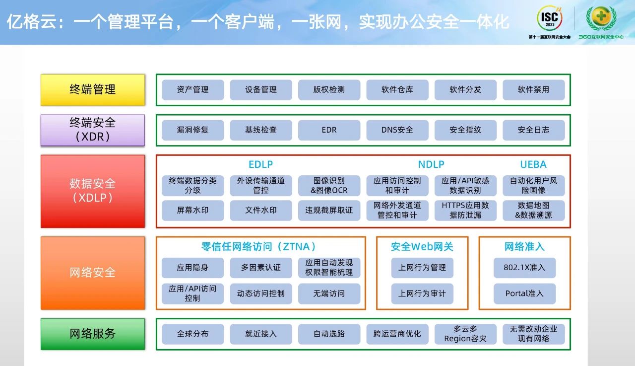 亿格云一体化的办公安全体系包含哪些能力?从网络服务、网络安全、数据安全、终端安全、终端管理等多个层面去构建包含零信任网络访问(ZTNA)、数据防泄漏(XDLP)、威胁检测响应(XDR)、防病毒(EPP)、上网行为管理(SWG)和统一端点管理(UEM)等一系列功能,