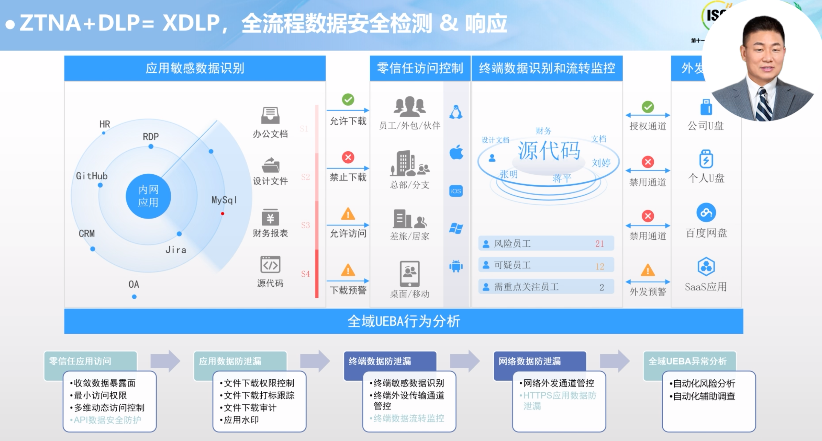 结合ZTNA跟DLP的XDLP,通过零信任应用访问、应用数据防泄漏、终端数据防泄漏,网络数据防泄漏、全域UEBA异常分析等链路实现对敏感数据的可视可管可控。从敏感数据的访问、下载、再到外发等一系列流转真正形成全流程数据安全检测与响应的闭环!