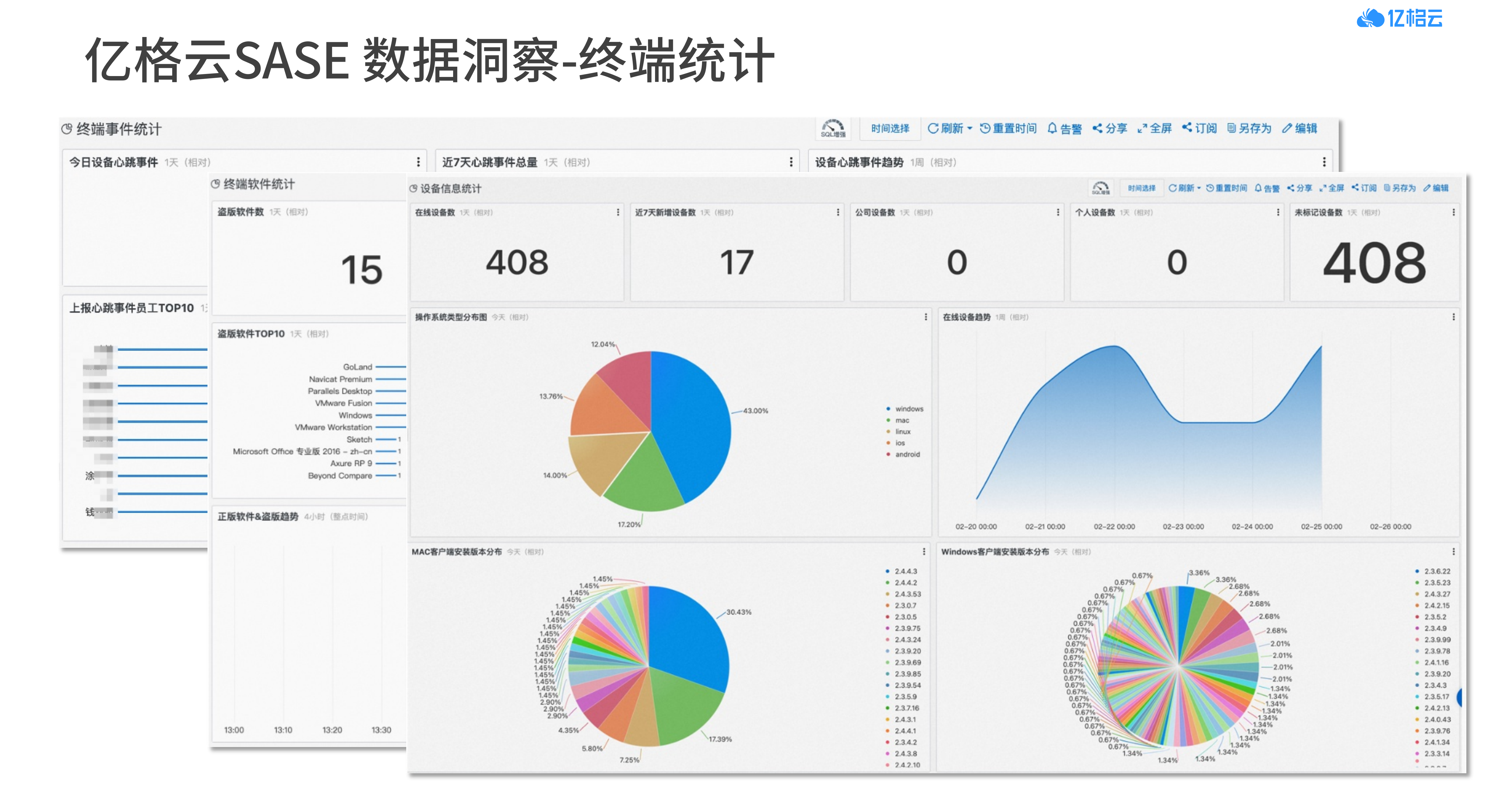 豁朗 还为大家展示了亿格云+阿里云SLS融合方案的实操案例,从“ 网络访问和数据安全统计、查询分析、终端统计、查询分析、告警统计”等5个方面展示,用户可以清楚地看到关于企业用户、数据、软件的动态与分析,能更高效的帮助企业进行安全管控与规避风险。