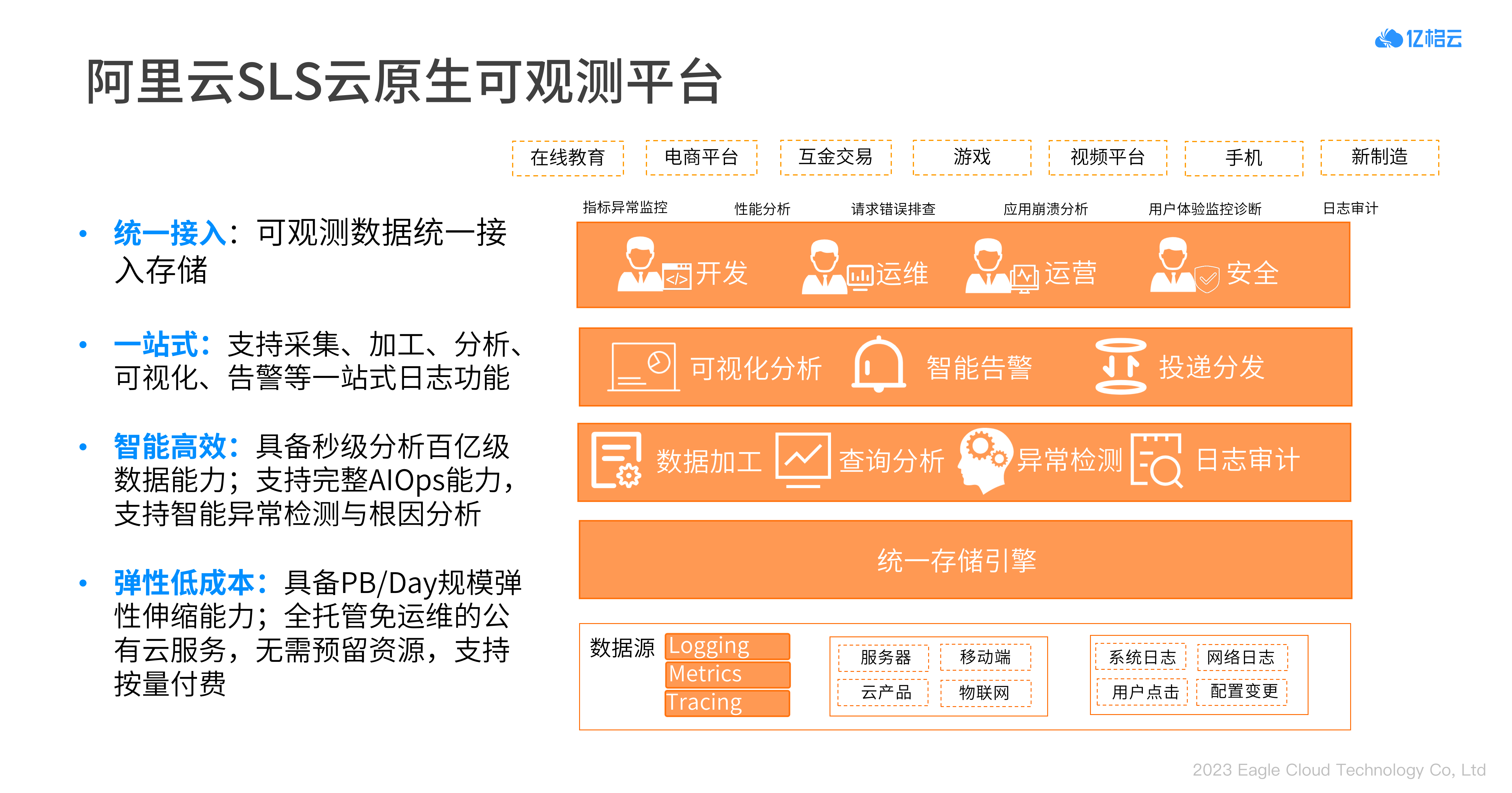 作为云原生可观测平台的阿里云日志服务SLS, 具备多源数据统一采集存储、灵活的数据加工ETL、高效智能的查询分析、智能告警中枢4大功能体系。同时具有统一接入、一站式服务、智能高效、弹性低成本等技术优势。