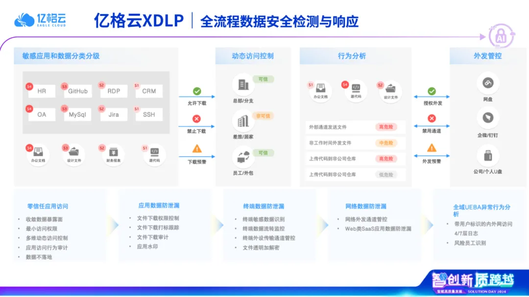 无独有偶,亿格云枢结合零信任创新性落地了XDLP(可扩展数据安全解决方案),打造一体化数据安全防护方案,实现从数据访问到外发的全链路跟踪,结合业务上下文和大语言模型技术提高敏感数据识别精准度,并通过UEBA进行全域风险评估,具体表现为以下方面: