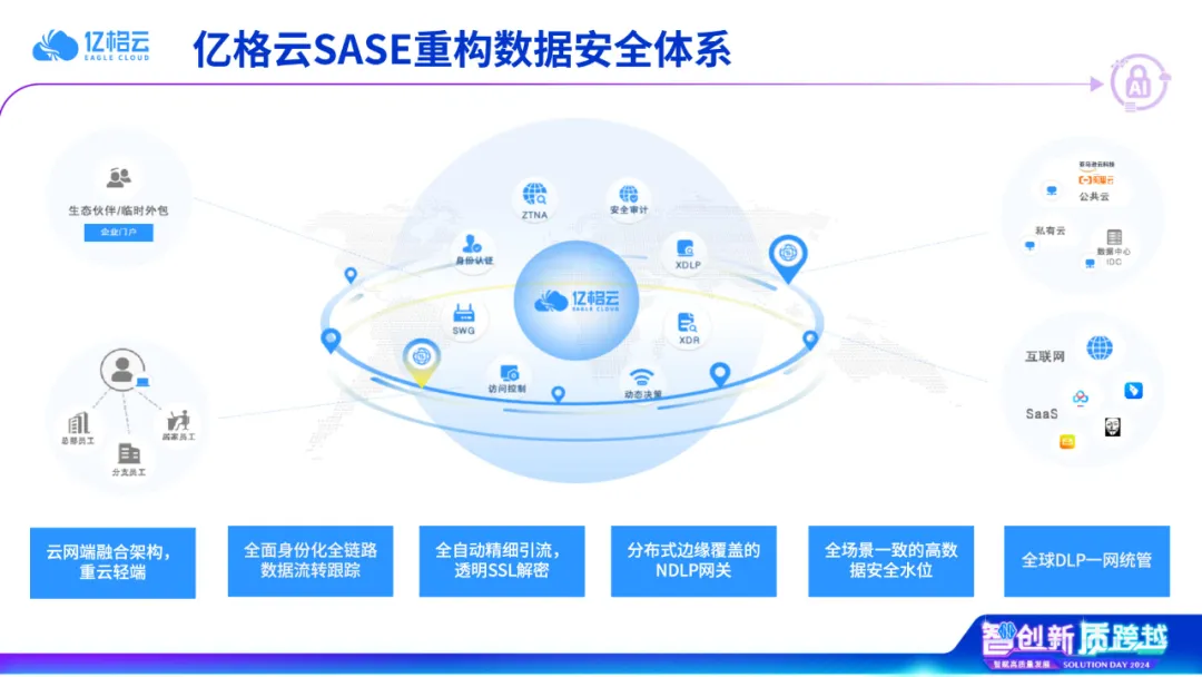 亿格云枢以一朵集中管控的云、一张全球加速的网和一个安全合一的端,解决端到端的安全问题。集成了ZTNA、XDLP、XDR、SWG等安全能力,用户通过全球分布的PoP节点快速接入业务和数据,并保障数据安全和使用体验。