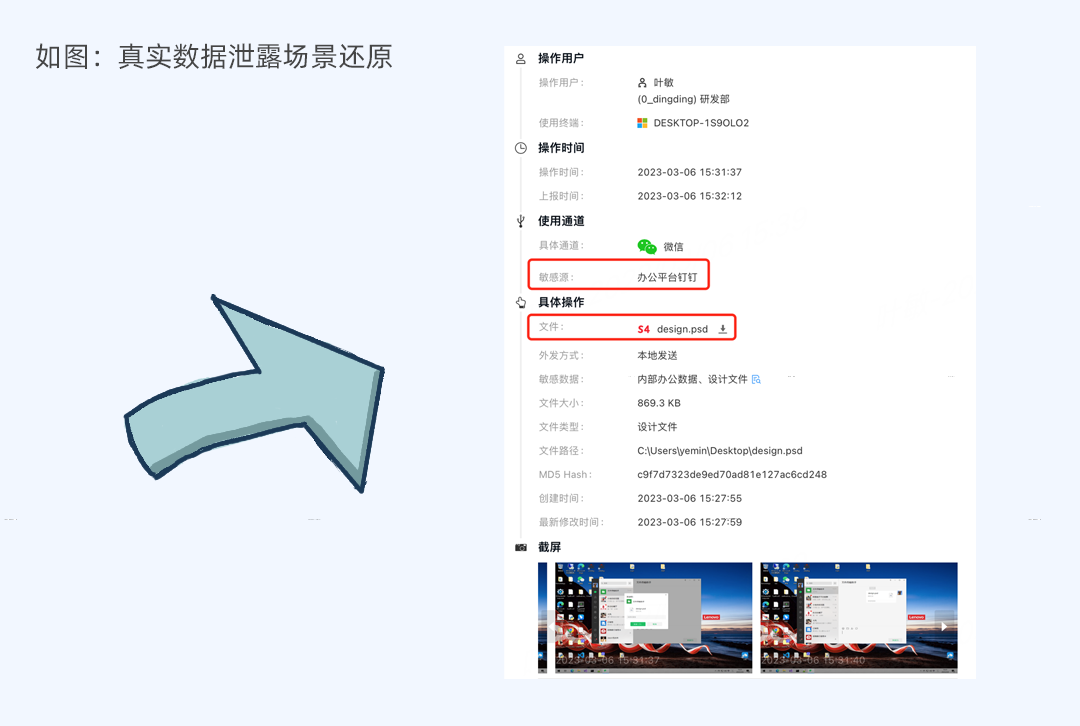 我们用图示意:员工(叶某)把钉钉下载的文件通过微信发出去,亿格云枢识别到文件是来源于内部办公的钉钉,所以把它标记为最高敏感级别S4,通过微信发送内部敏感数据是高风险行为。(危险危险危险危险~~)