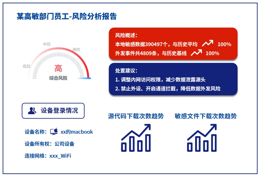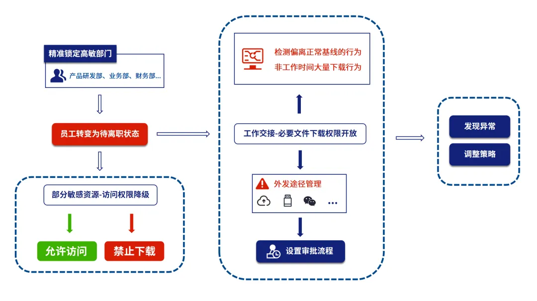 自高敏部门员工进入待离职阶段起,我们将通过智能 AI 风险分析系统密切关注其外发风险行为,倘若发现有员工在非正常工作时段大量下载敏感文件,信息安全管理部门必即刻警觉,迅速调整策略,进一步收紧其个人权限。