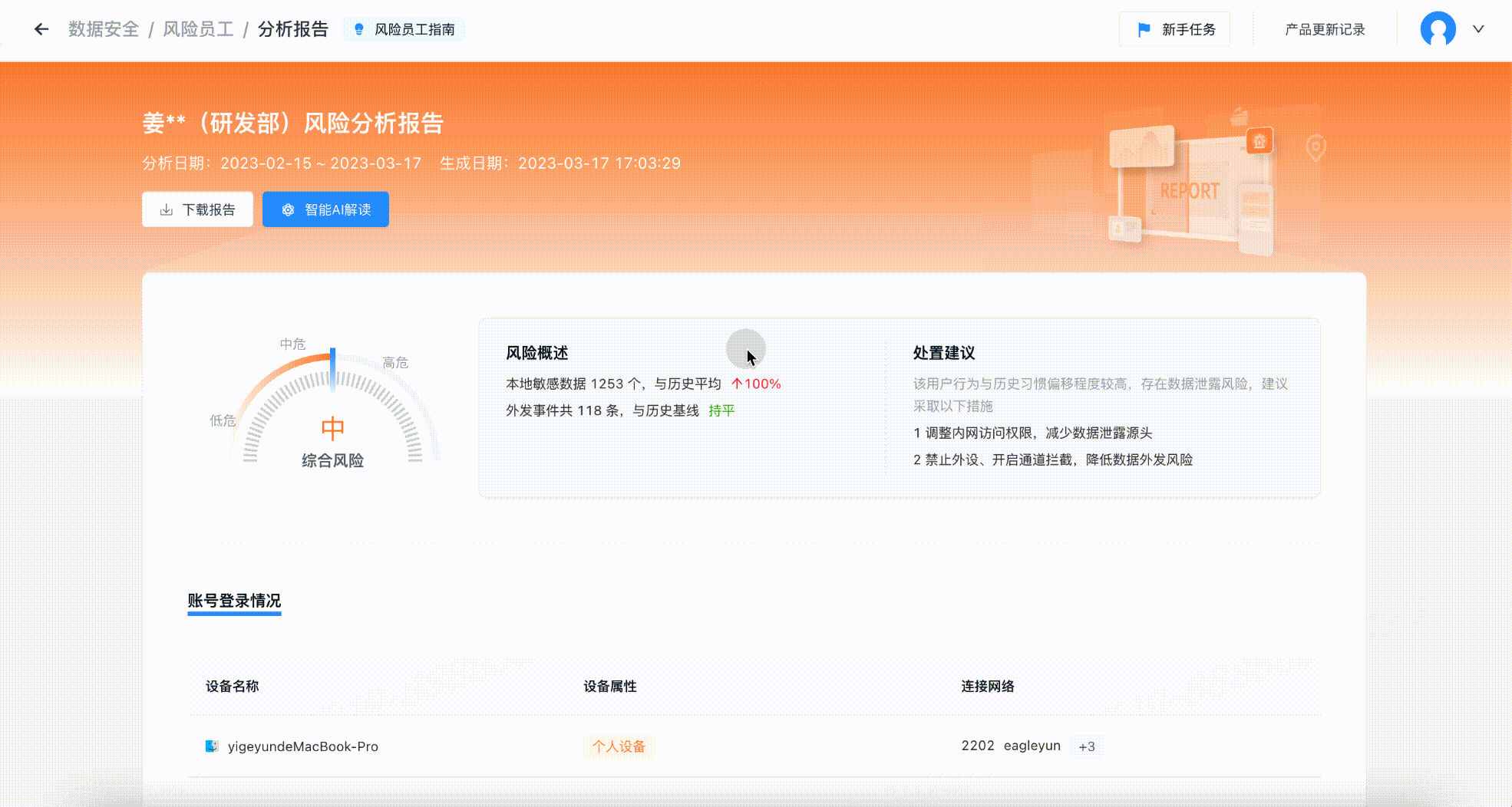 针对员工离职数据梳理、员工高频外发敏感数据等场景,提供了员工个人全面的「数据风险分析报告」,企业的安全/IT运维团队在后台从终端设备、数据囤积、数据外发三个维度清晰了解员工的数据风险行为,并作出相应决策。