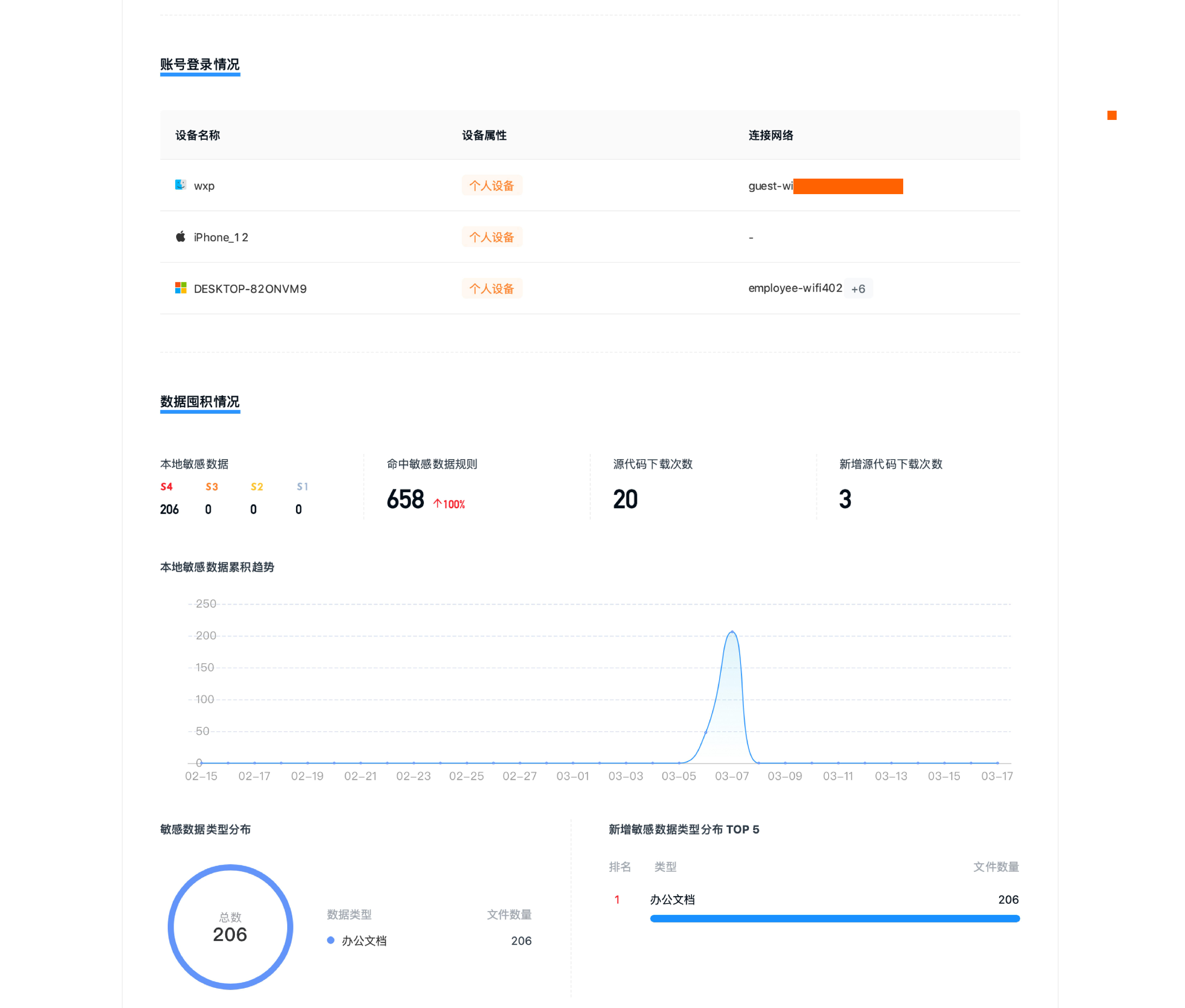 员工办理离职前,可借助数据风险分析报告,清晰知晓离职员工近一个月来的终端设备使用、网络接入情况、不同敏感级别的数据积累囤积情况及趋势、数据类型分布、是否下载留存敏感数据。