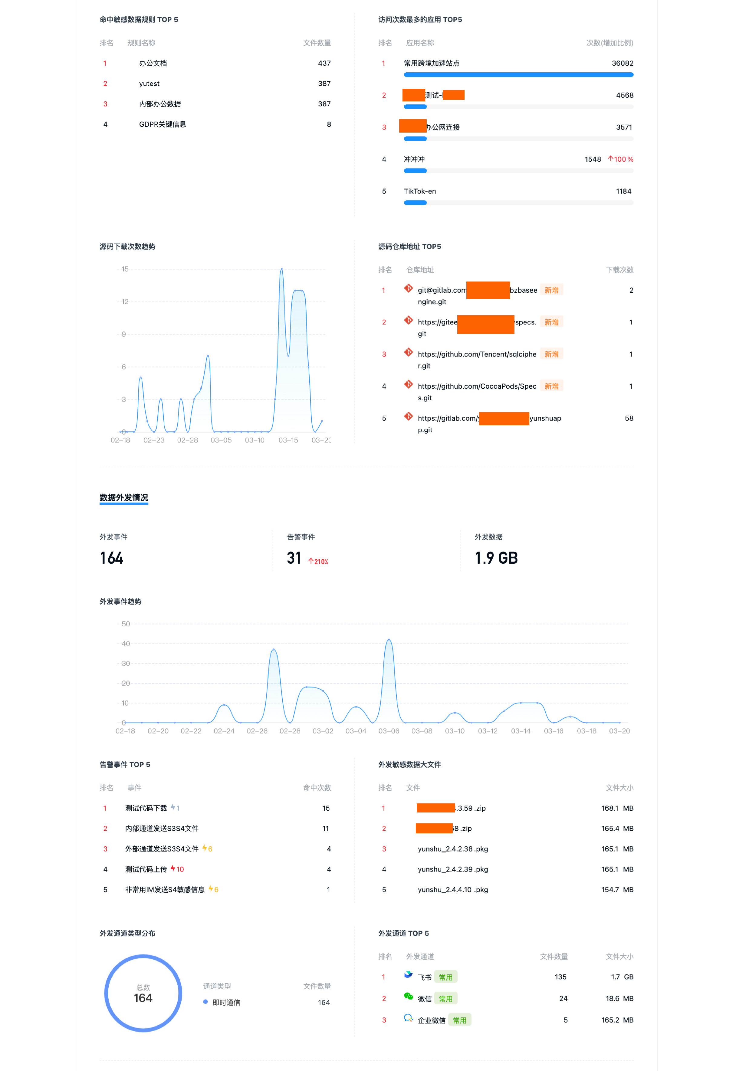 通过风险分析报告可直接统计高危员工近一个月来的下载的敏感数据、访问最多的应用、源代码下载趋势、搬运最多的源代码仓库地址,以及数据外发数量与趋势分析,外发的敏感大文件,外发通道,通过这些分析,能够清晰了解高危员工的数据行为,非常便于管理。